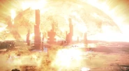 Die Oberfläche ist überzogen mit grau-schwarzem Sand und Gestein, übersät mit unzähligen Vex-Strukturen und die Sonne walzt in gewaltiger Größe über den Horizont.