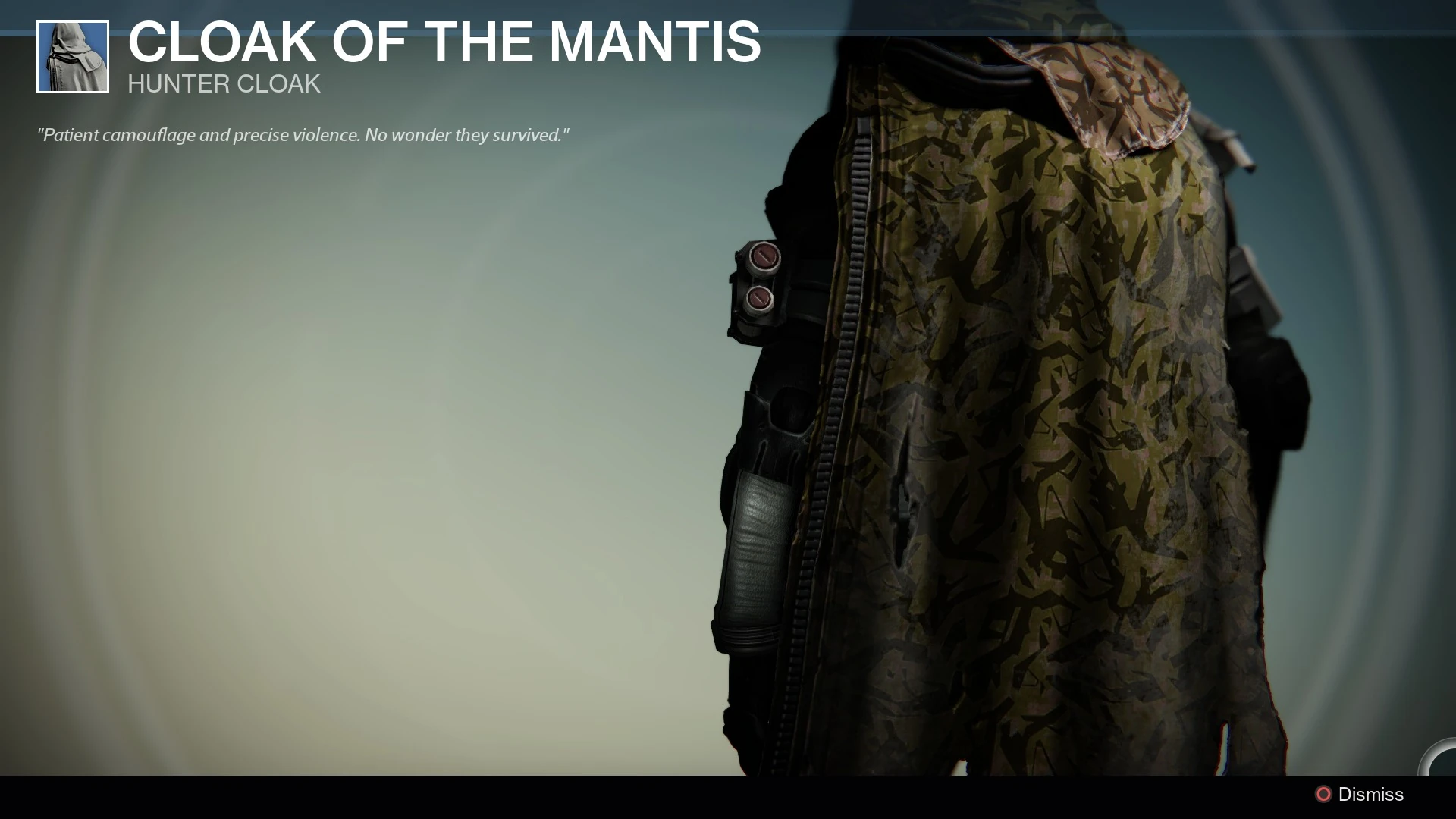 Cloak of the Mantis is a rarecloak. It can also be transferred between characters using the vault. Cloak of the Mantis can be dismantled to generate upgrade materials.