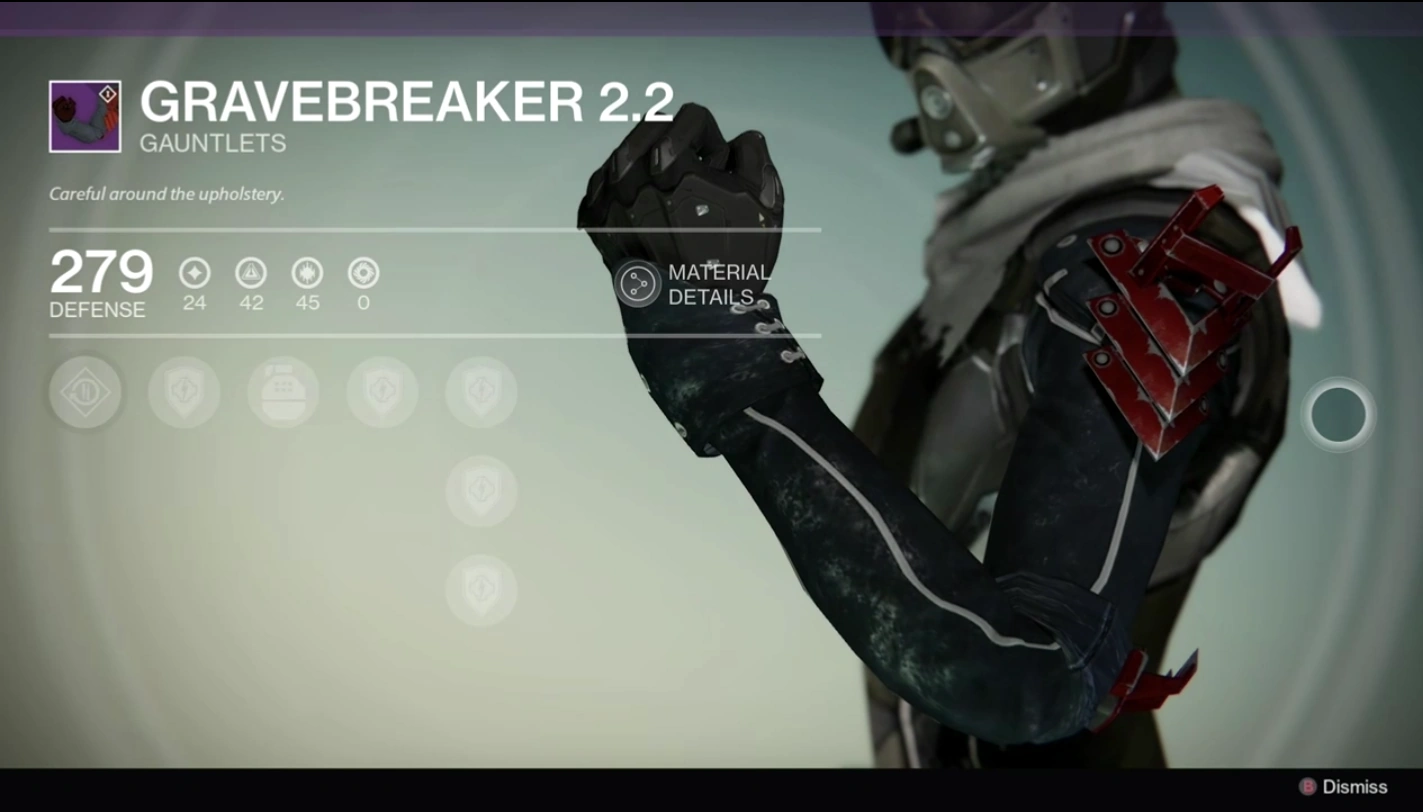 Gravebreaker 2.2 are legendary gauntlets able to be wielded by Hunters.[1] Gravebreaker 2.2 can be dismantled to generate Glimmer, Armor Materials, and Legendary Marks. It can also be transferred to other characters through the vault.